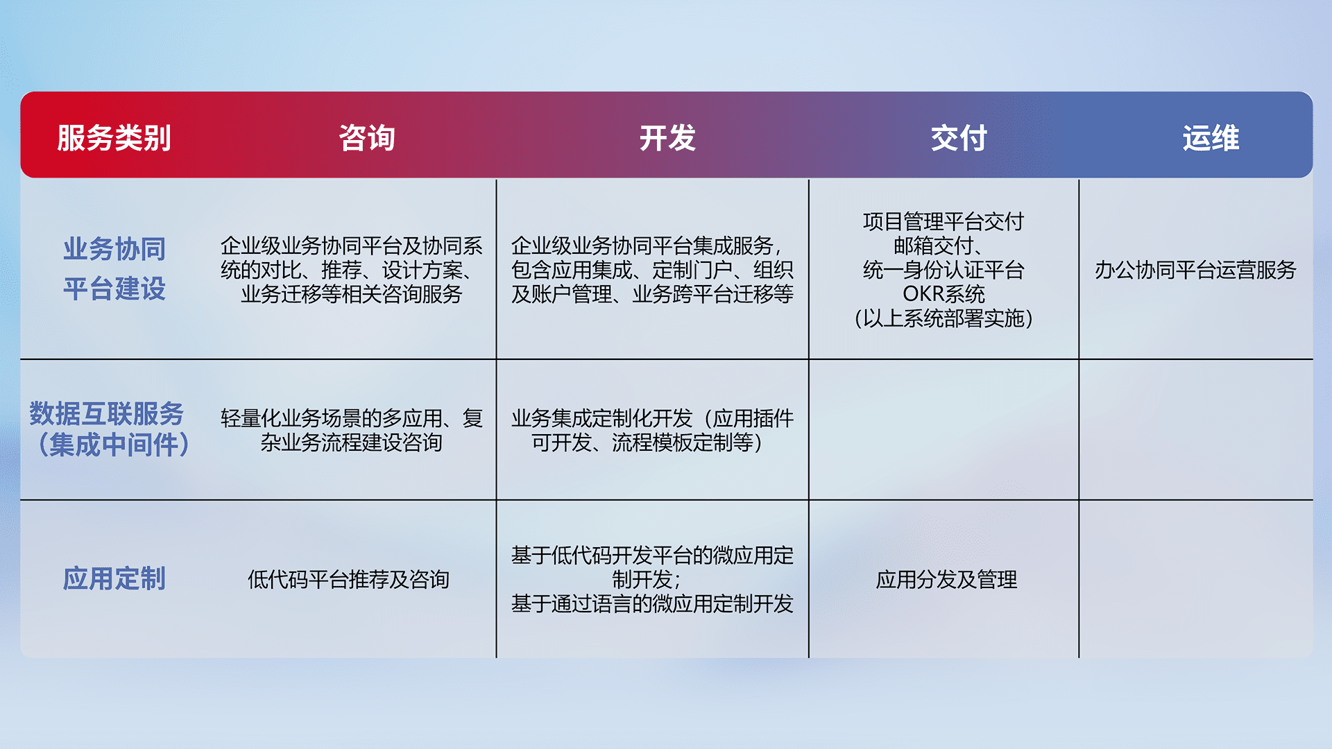 针对钉钉、、企微、、、IDaas等平台级产品提供产品的规划、、、、方案、、交付、、定制化开发等服务,,实现如统一协同办公、、、、智能客户服务、、、混合会议管理、、、、智能数据查询、、、、等业务场景,,,实现数字化转型。。。